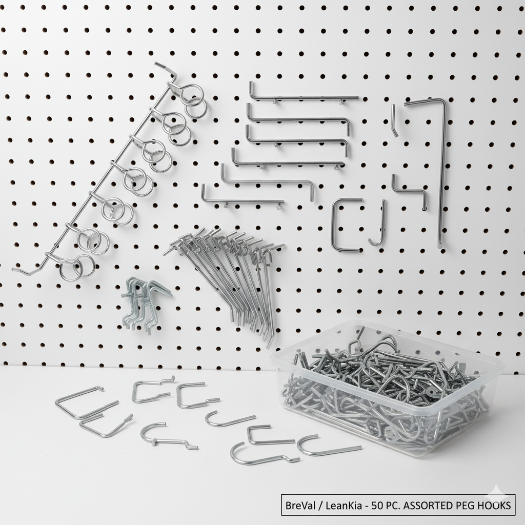 Upgrade your workspace with the LeanKia 50 Piece Metal Peg Board Assorted Hook Set, the ultimate solution for flexible tool and shelf organization.
